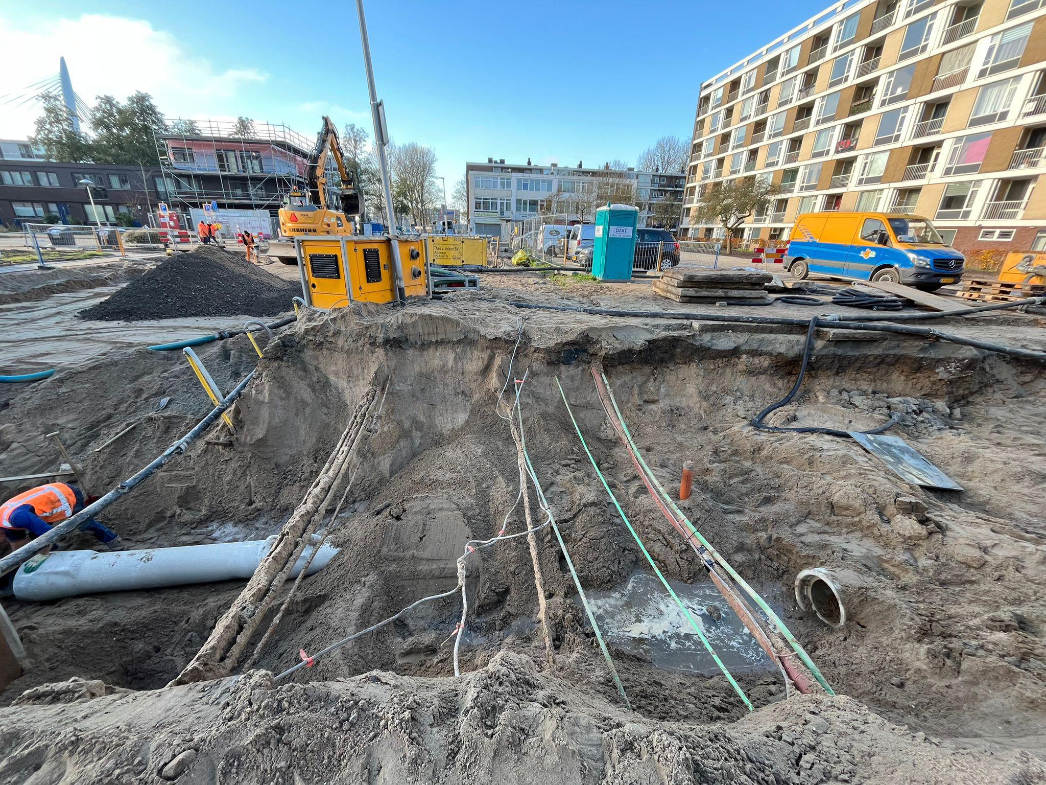 Naast het grondwater houden we ook rekening met de kabels en leidingen die door de wijk lopen. Dat ziet u goed op deze foto. We maken deze kabels eerst vrij en zorgen dat ze niet geraakt worden. Pas daarna kunnen we verder met het graven en het aanleggen van het nieuwe riool.