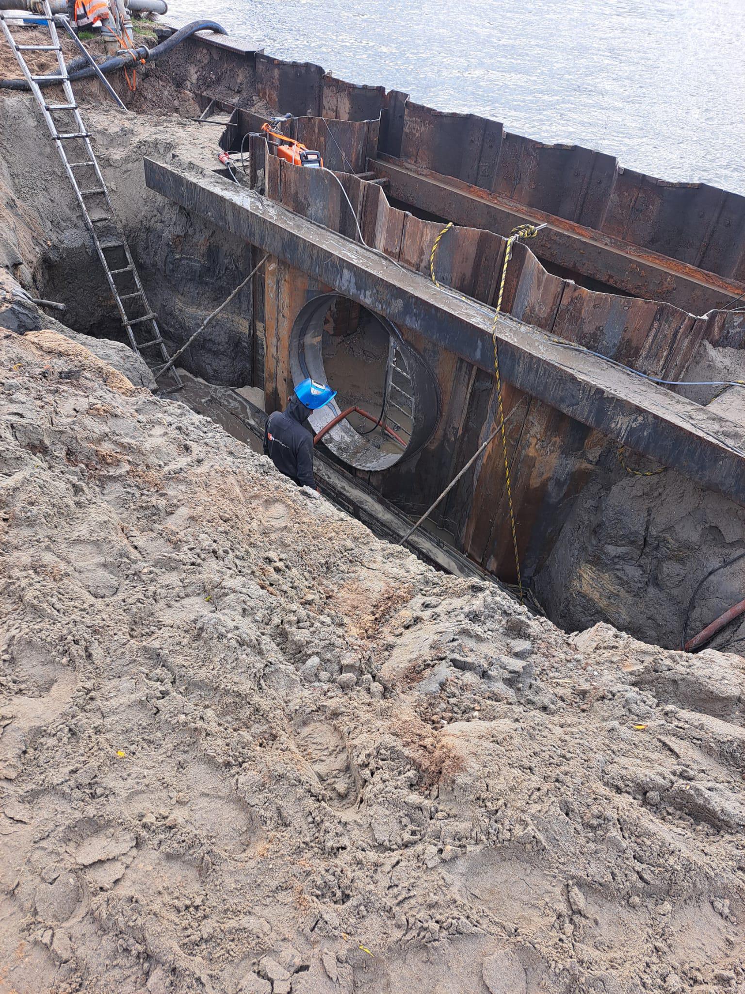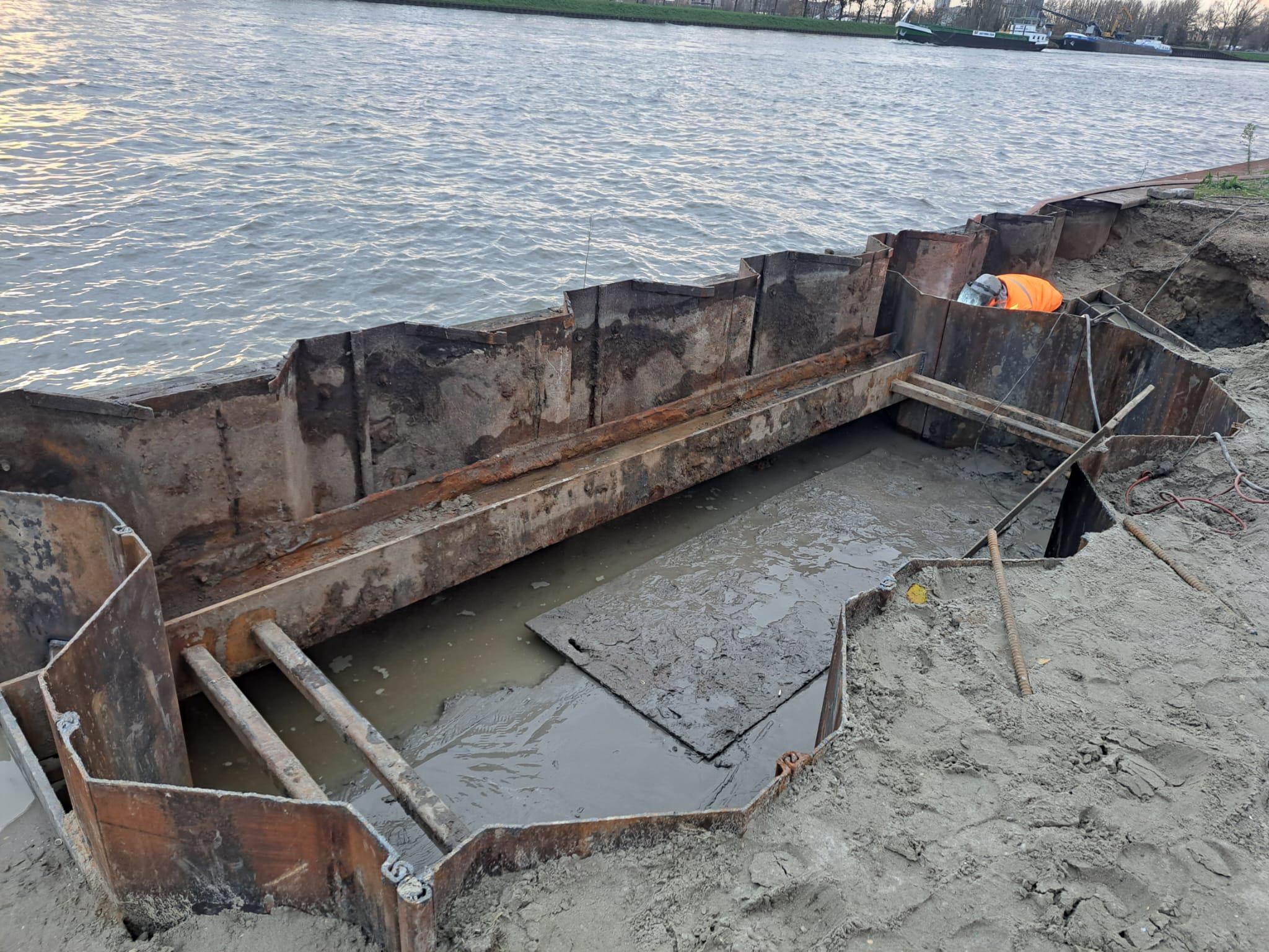 Bij het Amsterdam-Rijnkanaal werken we aan de aansluiting voor het regenwater. Op de foto’s ziet u dat we een stuk uit de damwand hebben gelast. Zo maken we ruimte voor het nieuwe riool. Ook ziet u dat er ronde uitsparingen in de damwand worden gemaakt. Deze rondingen zijn nodig om de damwand straks waterdicht te maken. Dat doen we door de ruimte rondom het riool op te vullen met zand en cement.